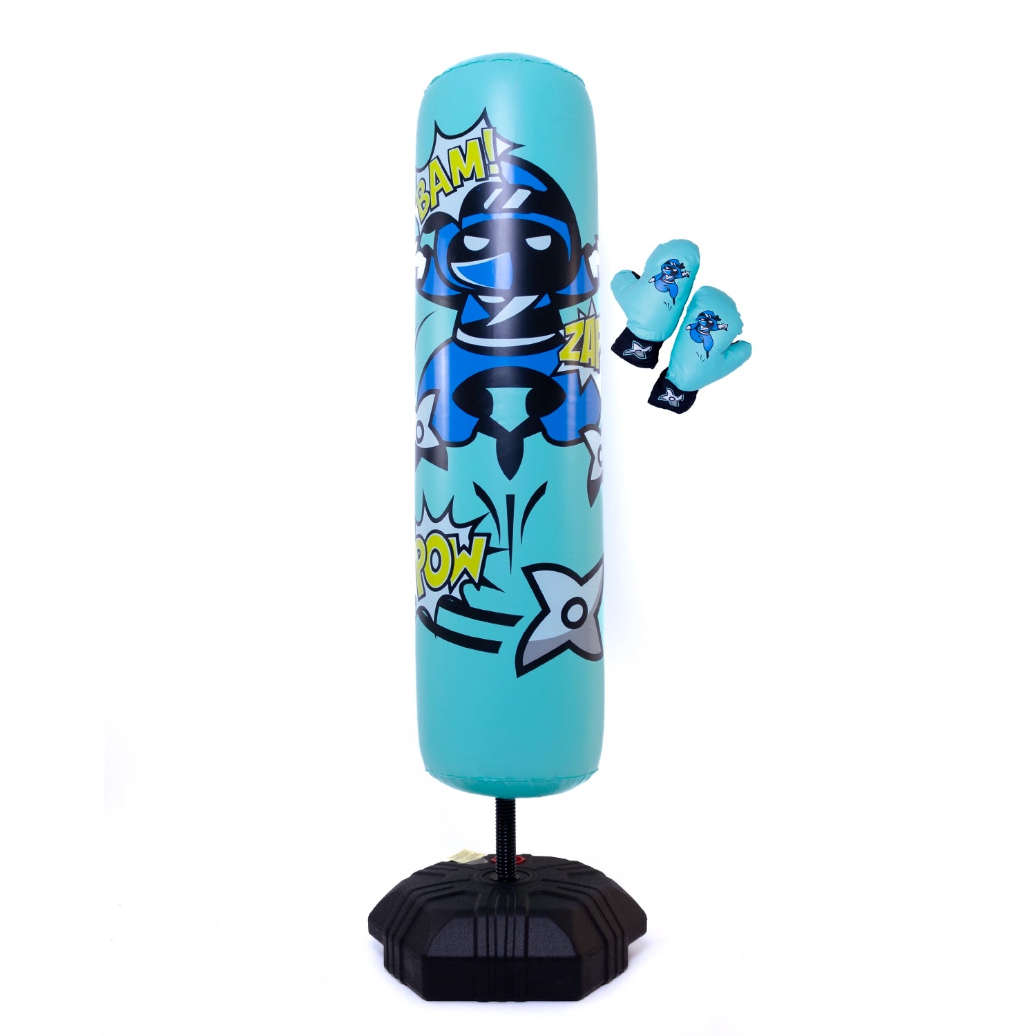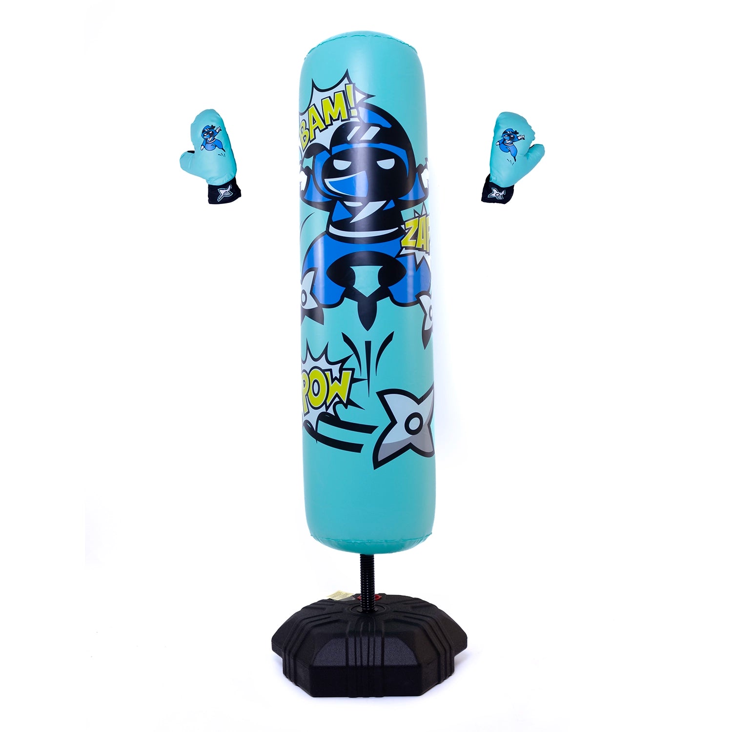 Dieser aufblasbare Boxsack verfügt über einen beschwerten Sockel und eine integrierte Feder für mehr Stabilität sowie zwei Boxhandschuhe für den sofortigen Einsatz.